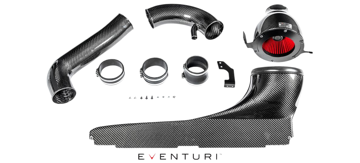 Indsugningen er opbygget omkring Eventuris patenterede Venturi-design, hvor filter og airbox er integreret i én samlet carbon-enhed. Denne konstruktion sikrer et kontrolleret og laminart luftflow uden turbulens direkte mod turboladeren, hvilket reducerer restriktioner og forbedrer motorens effektivitet – både ved standard og opgraderet motorstyring.