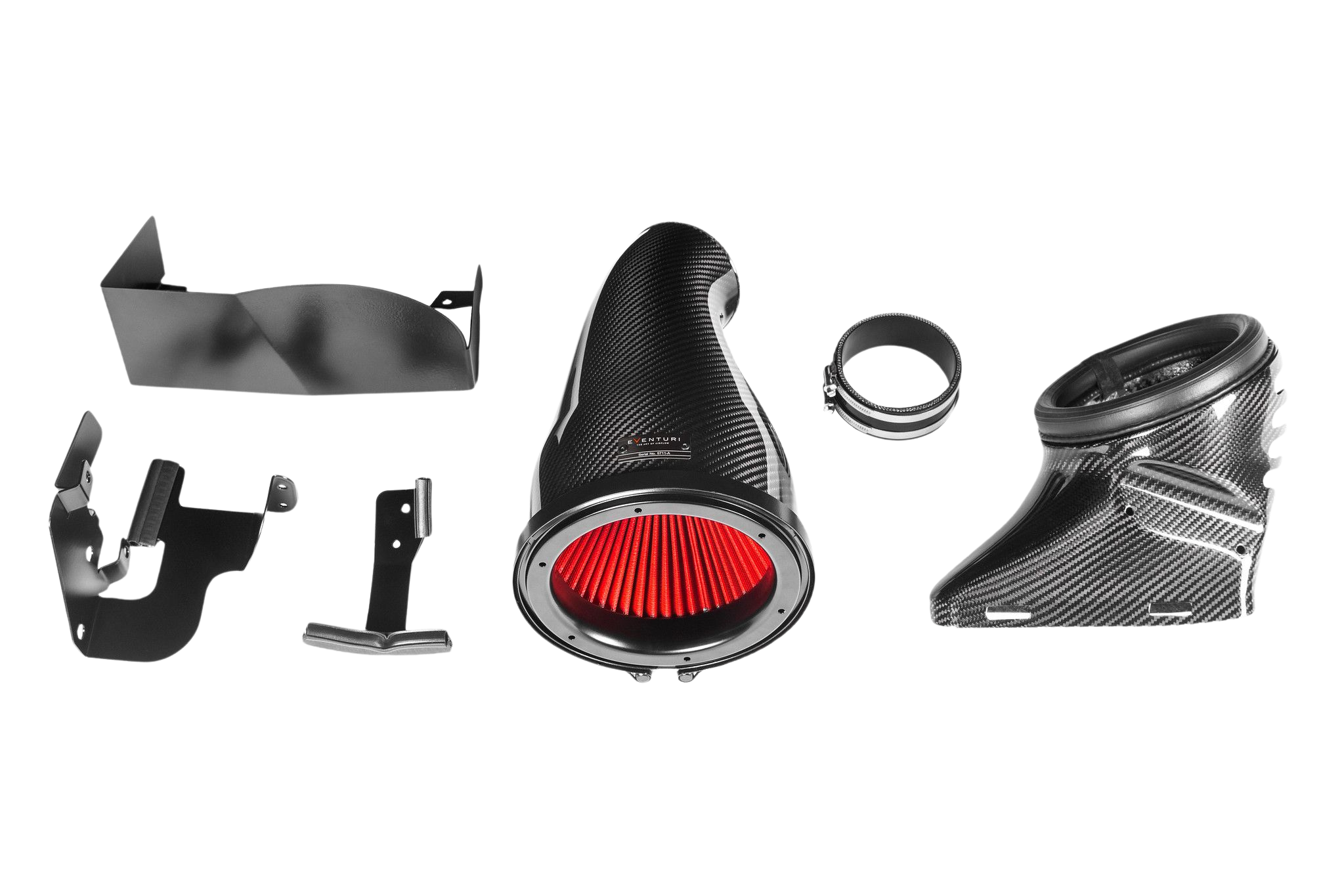 Indsugningen benytter Eventuris patenterede Venturi-design, hvor filter og airbox er integreret i én samlet carbon-enhed. Denne konstruktion sikrer et kontrolleret, laminart luftflow uden turbulens direkte mod turboladeren, hvilket giver mere effektiv lufttilførsel, hurtigere spool og en mere direkte motorkarakter – både ved standard og opgraderet motorstyring.