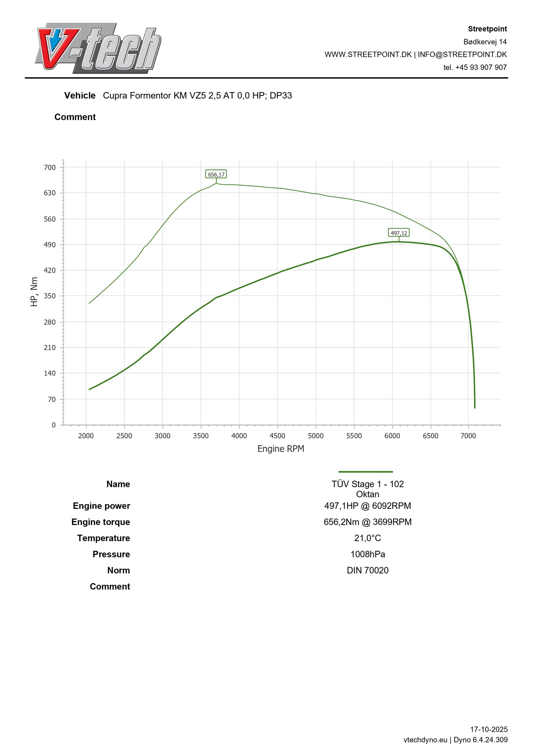 Få det bedste ud af din 2.5 TFSI-motor med vores TÜV godkendte Stage 1 tuning – udviklet specifikt til Audi RS3 8Y & Cupra Formentor VZ5 m. DNWB, DNWC & DNWD Motoren. Med en effektforøgelse til ca. 480 hk og 680Nm (NB: Angivelse v. 102okt.), får du markant forbedret respons, acceleration og køreglæde – uden at gå på kompromis med driftssikkerhed eller lovgivning.